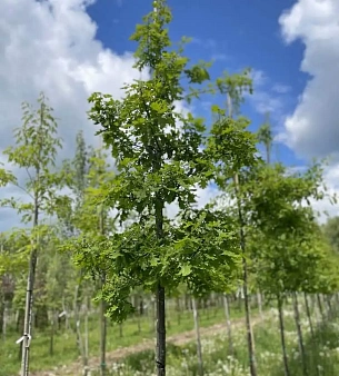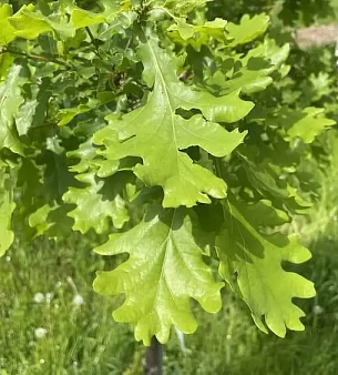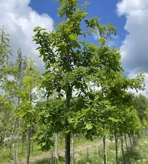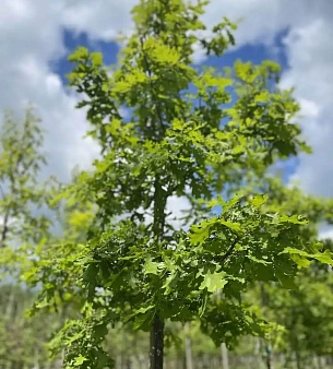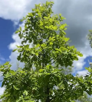 Дуб черешчатый до 40 метров в высоту, статное дерево с красивой раскидистой кроной, в среднем живёт до 400 лет, но отдельные экземпляры и до 2000. Наиболее распространённая разновидность дубов в России. Не требователен к почвам, засухоустойчив. В питомнике можно купить оптом.