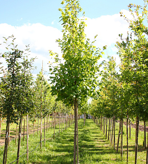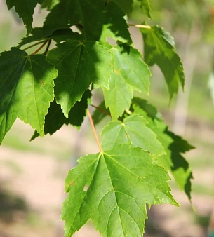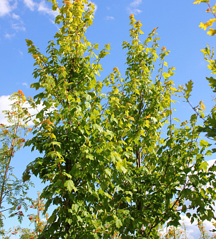 Клен красный «Сканлон» высотой до 14 метров. Цветы на длинных цветоножках, с длинными тычинками, появляются раньше листьев. Листья от красных весной, зелёно-серебристых летом, до серебристо-жёлтых, багряных осенью. Не любит ветра, уплотнённых почв. В питомнике можно купить оптом.