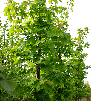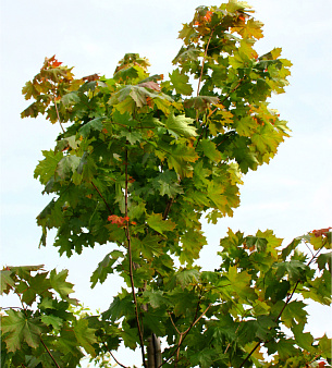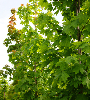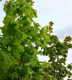 Клен остролистный «Колумнаре» высотой до 30 метров, с красивыми резными сранительно небольшими листьями, которые удивляют разноцветьем осенью — чаще жёлтоватые оттенки, с красными вкраплениями и разводами. Любит солнце, но теневынослив, не любит декоративную обрезку. В питомнике оптом.
