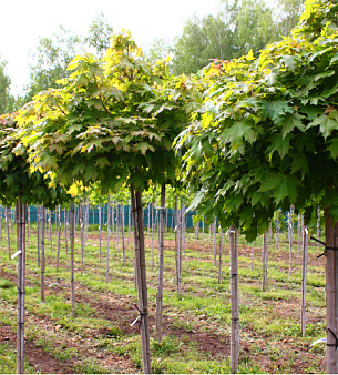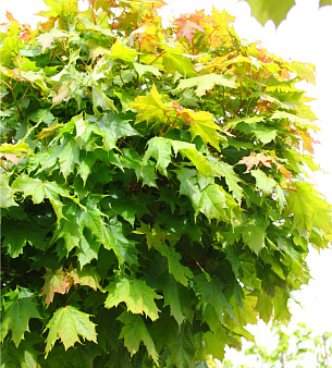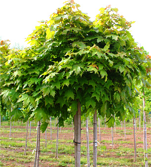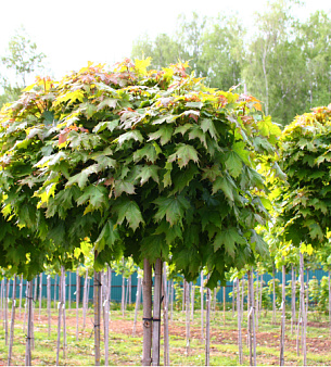 Клен остролистный «Глобозум» высотой до 30 метров, крупные резные пятилопастные листья до 18 сантиметров. Цвётет в период распускания листьев, осенью листва широкого разноцветья. Не быстро растёт, любит плодородную почву, морозостойкий, ветроустойчив. В питомнике оптом.