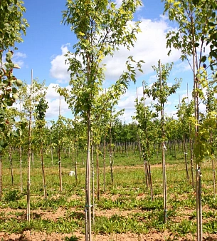 Клен сахарный (серебристый) «Пирамидале» высотой до 20 метров, морозоустойчив, не боится городской загазованности, сырых почв, хорошо растёт на солнце и в полутени. Листья с глубокими врезами, особенно красивы осенью — от жёлтых до пурпурных расцветок. В питомнике можно купить оптом.