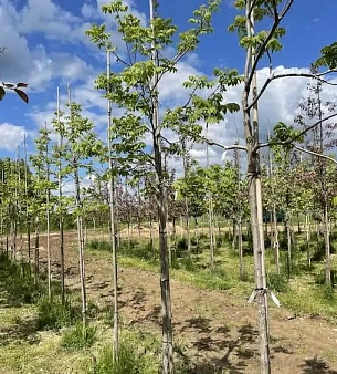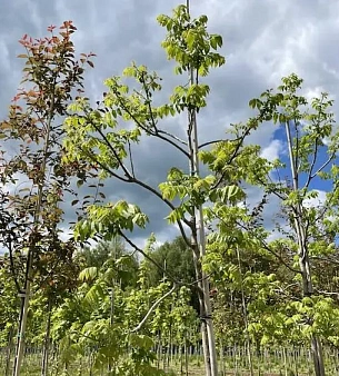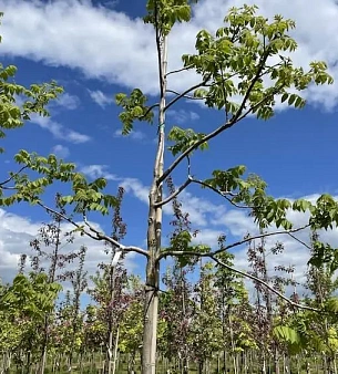 Орех чёрный до 40-50 метров, самая высокая разновидность орехов, с раскидистой кроной, чёрный цвет плодов и коры. Теневынослив, мирится с небольшим подтоплением, с сухостью воздуха, любит глубокие питательные почвы. Средней морозостойкости. В питомнике саженцы разных размеров, оптом.