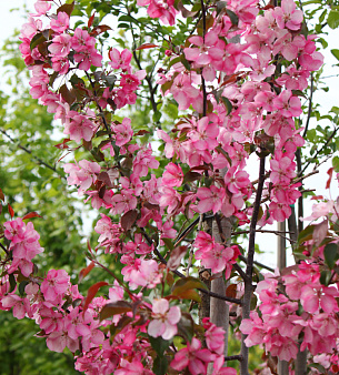 Яблоня декоративная «Рудольф» высотой до 6 метров. Много крупных цветов весной, розовые и малиновые. Листья красноватые при распускании, затем зеленеют. Плоды мелкие, декоративные, долго не падают. Любит свет и плодородные почвы, зиму переносит хорошо. В питомнике можно купить оптом.