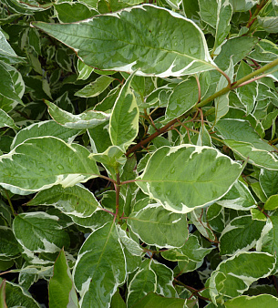 Лиственный кустарник до 3 м высотой с раскидистой кроной. Кора на молодых побегах красная, позже темно-красная. Лист белоокаймленный. Цветение в мае-июне. Не теряет своей декоративности при выращивании в тени.