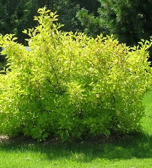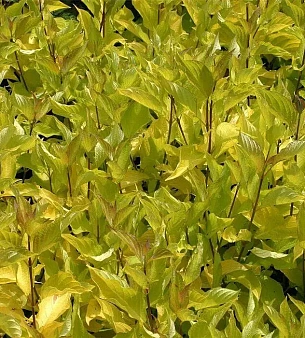 Дерен белый «Аурея» до 2 метров высотой. Листья жёлто-матовые, красные осенью. Цветки кремово-белые. Иногда цветет второй раз осенью, тогда на кусте одновременно цветки и голубовато-белые плоды. Любит солнце, в тени листья не становятся золотистыми, морозоустойчив. В питомнике можно купить оптом.