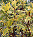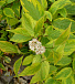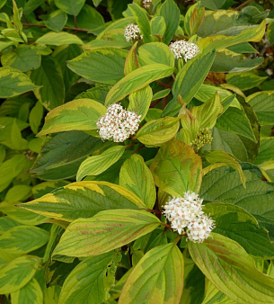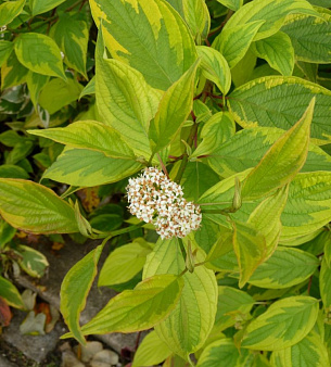 Дерен белый «Гоучалти» до 2 метров высотой. Необычного окраса листья — зелёные с жёлтой каймой и розоватым оттенком. Белые цветы соцветьями, круглые плоды не съедобны. Любит солнце, втени может терять особый окрас листьев. Морозостоек, предпочитает влажные почвы. В питомнике можно купить оптом.