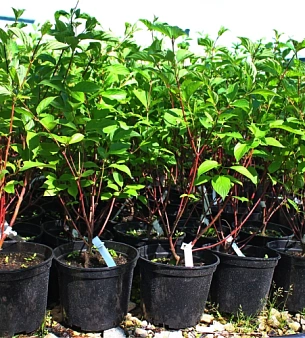 Дерен белый «Сибирика» до 3 метров высотой. Молодые побеги ярко-кораллового цвета. Цветёт в июне бело-жёлтыми цветами. Листья зелёные, глянцевые, осенью становятся тёмно-фиолетовыми. Морозоустойчив, теневынослив, любит влагу. В питомнике саженцы можно купить оптом.