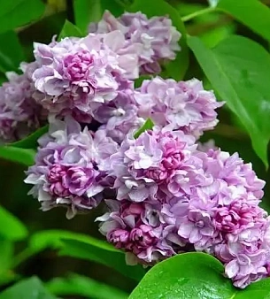 Сирень обыкновенная «Катарина Хевемейер» до 5 метров высотой. Бутоны пурпурно-лиловые, махровые, 2-3 венчика. Цветы розово-лиловые, более яркие снизу, приятный аромат. Соцветия до 24 сантиметров, обильное цветение. Неприхотливая, морозостойкая. В питомнике можно купить оптом.