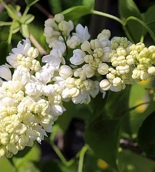 Сирень обыкновенная «Лунный свет» высотой до 3-4 метров. Бутоны зеленовато-белые, цветки махровые белые с едва заметным кремовым или бледно-голубым оттенком, со сладким медовым ароматом, обильное цветение. Любит солнце, но выносит и полутень. В питомнике саженцы можно купить оптом.
