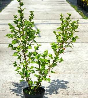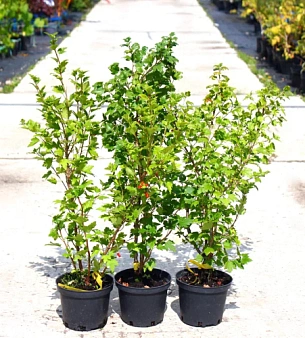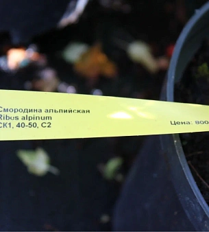 Смородина альпийская до 2,5 метров высотой. Цветки зеленоватые, до 20 штук в кистях длиной до 4 сантиметров. Листья необычные трёхлопастные, зубчатые, осенью от бледно- до жёлто-охристых оттенков. Может расти даже на каменистых почвах, теневынослива, зимостойка. В питомнике можно купить оптом.