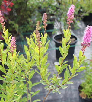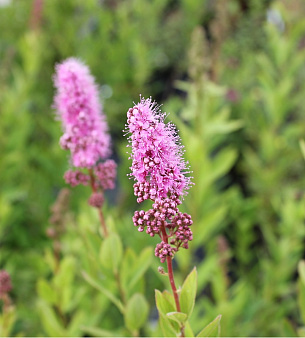 Спирея Билларда до 2 метров высотой. Гибрид между Спиреей Дугласа и Спиреей иволистной. Ярко-розовые цветки в узких пирамидальных метельчатых соцветиях до 20 сантиметров длиной. Цветёт со второй половины лета до заморозков. Листья длинные, узкие, заострённые. В питомнике можно купить оптом.