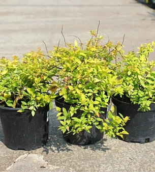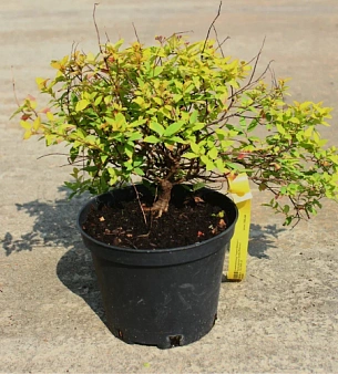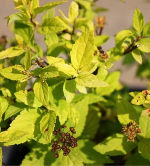 Высота 0,5 м - 0,6 м. Некрупные розовые щитковидные соцветия появляются в июне-июле. Листья весной ярко-желтые, летом светло-желтые, осенью-оранжево-желтые.