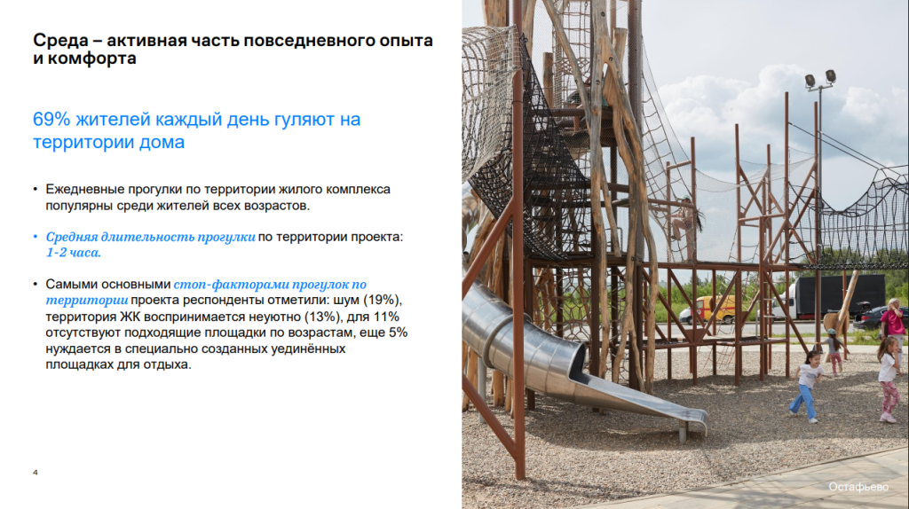 Факт высокой вовлеченности жителей: 69% жителей каждый день гуляют на территории своего жилого комплекса. Это практика, популярная среди всех возрастных групп.