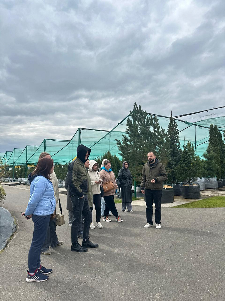 Заместитель директора по сельскохозяйственному производству — Колдушко Денис Владимирович и ландшафтные архитекторы — сопровождали учеников Школы ландшафтного дизайна, подробно освещая тему мероприятия: «Контейнерное производство. Развитие садового центра в условиях импортозамещения».